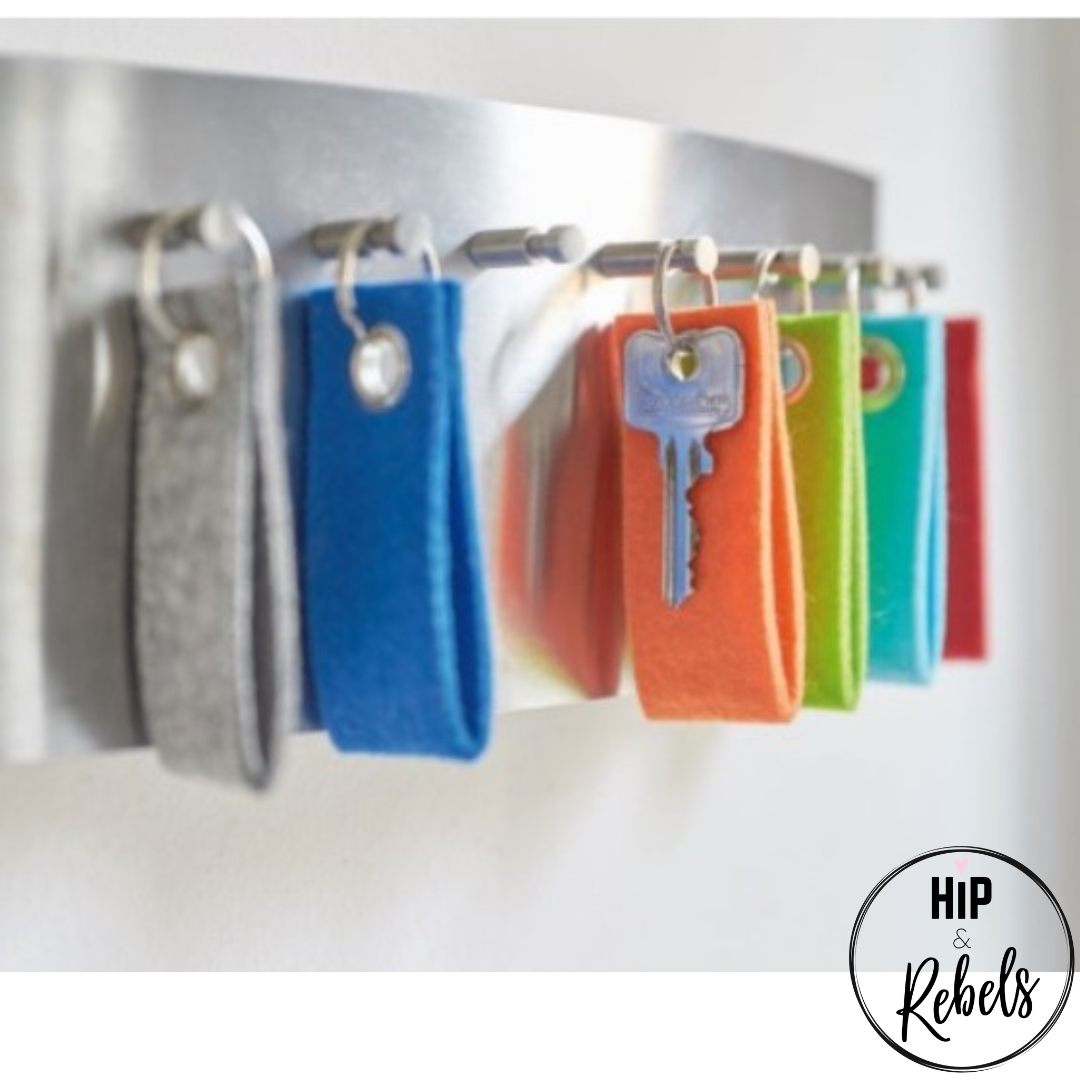 De sleutelhangers zijn leverbaar in Rood, Grijs, Blauw, Oranje, Appelgroen of Turquoise.