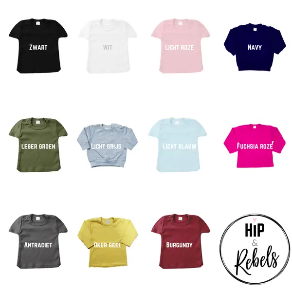 Er is keuze uit een t-shirt met korte mouw, t-shirt met lange mouw of een sweater. Verkrijgbaar in de maten 56 t/m 104-110 in verschillende kleuren.