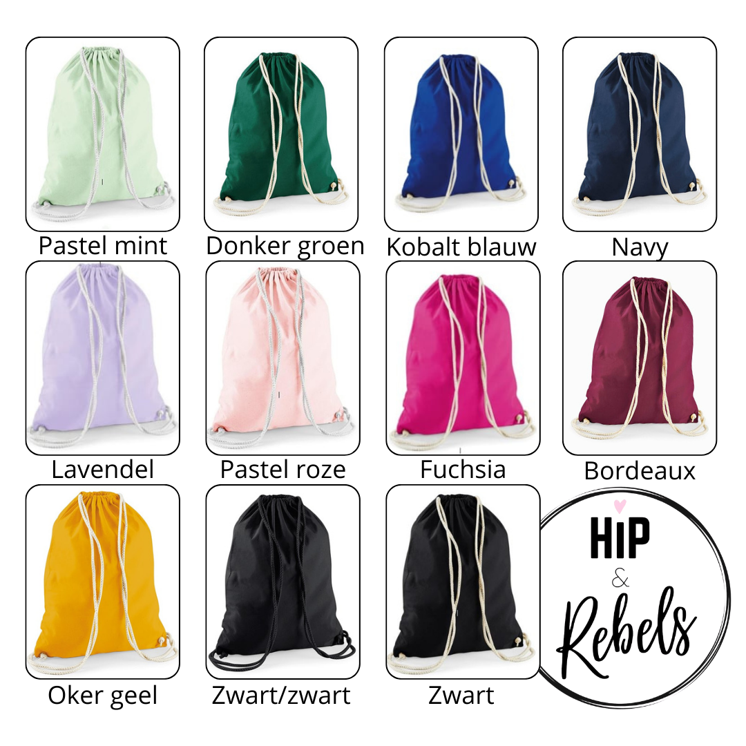 De tassen zijn gemaakt van 100% katoen waardoor je er lang plezier van hebt. De tassen hebben één groot hoofdvak met handige trekkoordsluiting. Zo kun je de tas makkelijk dragen over de schouder of op de rug. De tassen zijn 37x46 cm en in veel verschillende kleuren verkrijgbaar.